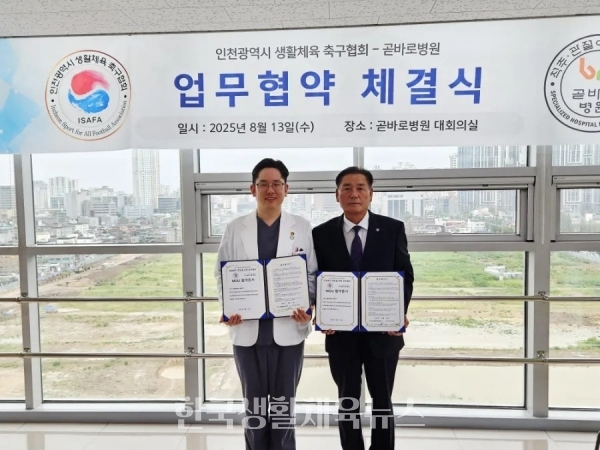 인천광역시 생활체육 축구협회(회장 장만경)와 곧바로병원(병원장 신승준)이 업무협약(MOU)을 체결하고, 생활체육 활성화와 지역 주민의 건강 증진을 위해 힘을 모으기로 했다.