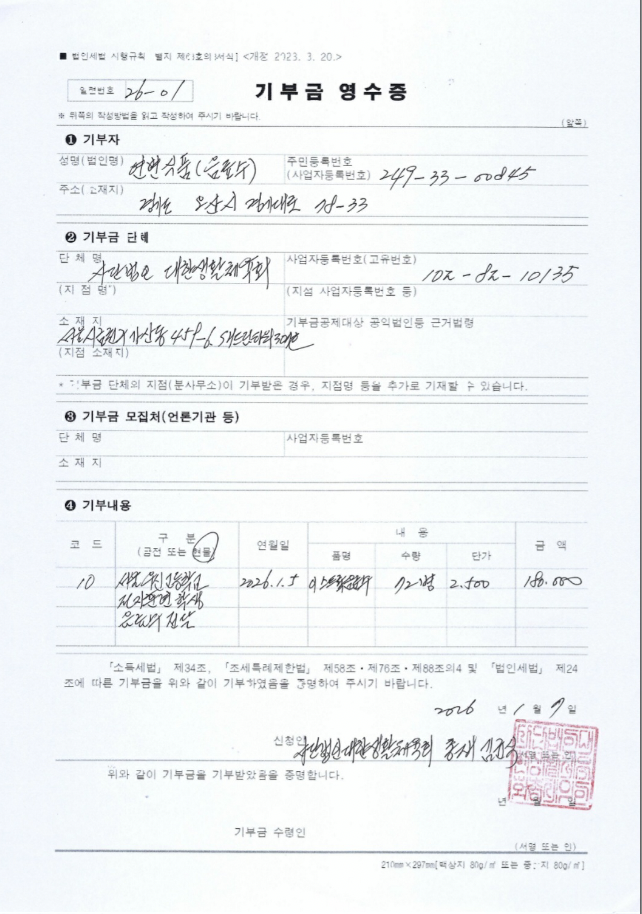2026-01-7 서울시 우신고등학교 야구부 음료수 기부금(현물)영수증