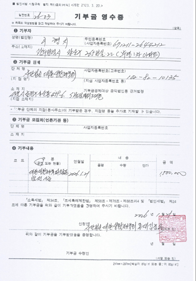 2026-01-22 대한생활체육회 파크골프협회 발전기금 기부금(현금)영수증